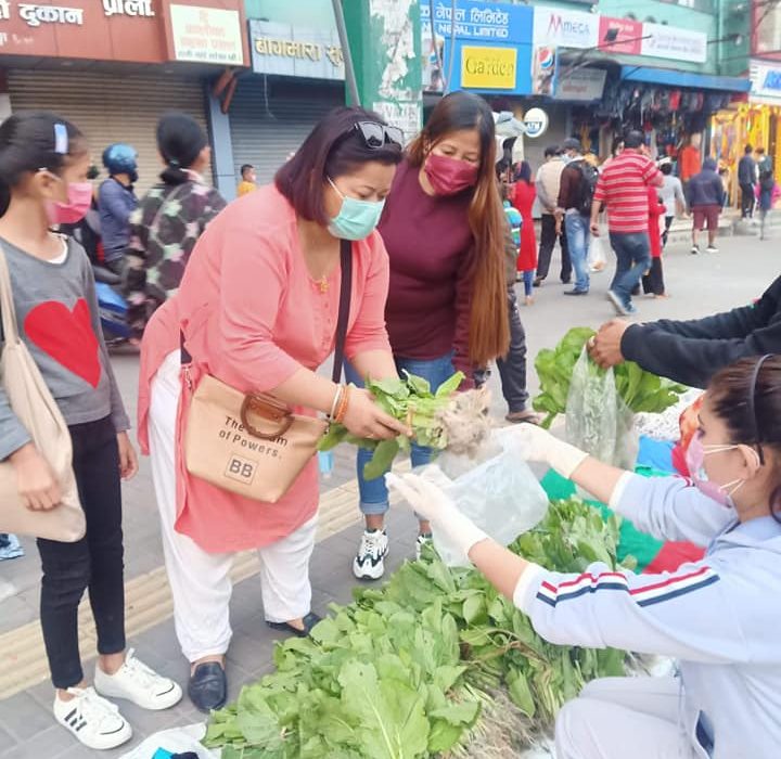 हरियो सागपात स्वास्थ्यको लागि फाईदाजनक हुन्छ भन्ने कुरालाई अंगिकार गर्दै साग खरिद गर्दै महिलाहरु, वहाँहरु खरिदकर्ताहरु र पसले सबैले स्वास्थ्यको महत्व बुझ्दै मास्क प्रयोग गरेको देखिन्छ ।