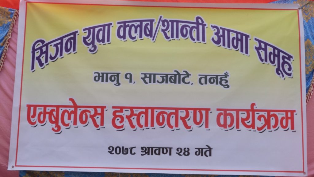 तनहूँ । भानु नगरपालिका वडा नं. १ साजवोटेमा रहेको सिजन युवा क्लब र शान्ती आमा समुहको सक्रियतामा एम्बुलेन्स संचालन आएको छ । २०७६ साल असार १८ गतेबाट २५ गतेसम्म एम्बुलेन्स खरिदको सहयोगार्थ लागि उक्त क्षेत्रमा महायज्ञ संचालन गरिएको थियो । उक्त महायज्ञमा सबैभन्दा बढि रकम १ लाख ५५ हजार दान गर्ने दानविर बन्दिपुर १ डुम्रे निवासी ईश्वर कुमार श्रेष्ठको प्रमुख आतिथ्यतामा आईतबार एम्बुलेन्स हस्तान्तरण तथा उद्घाटन कार्यक्रमको आयोजना गरियो ।