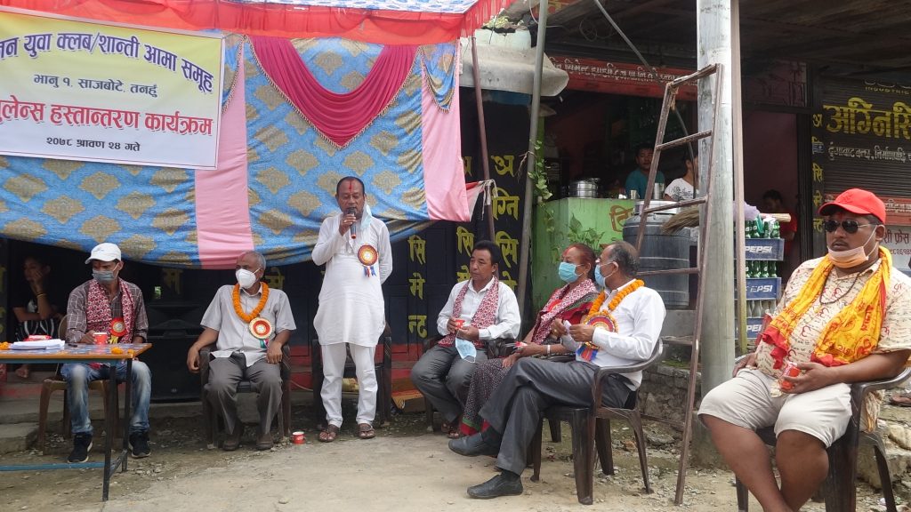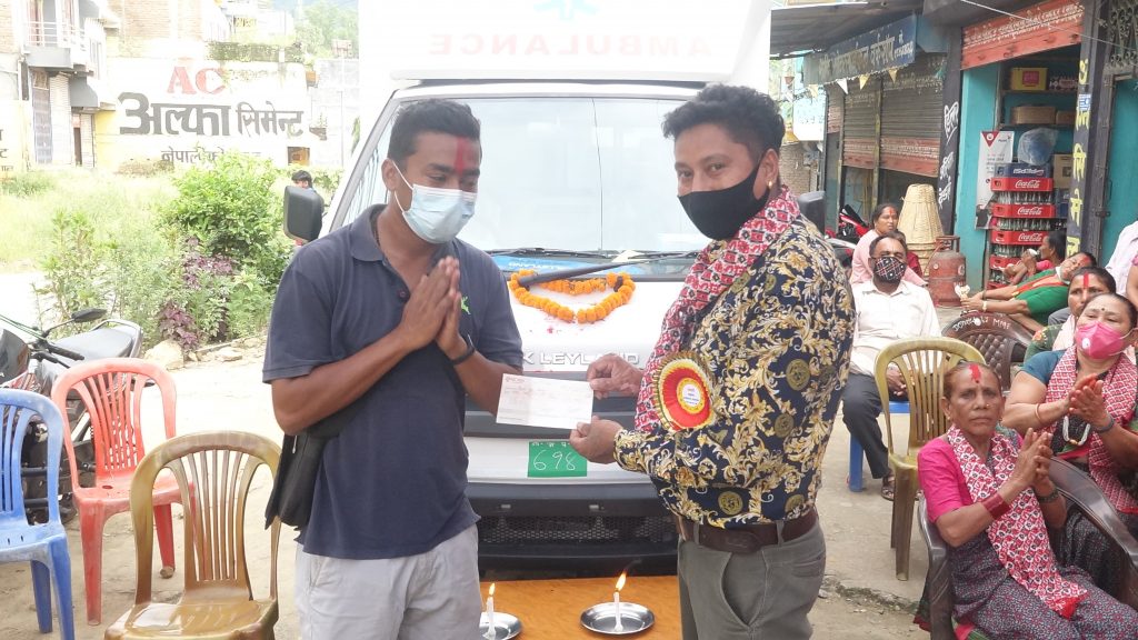 उक्त अवसरमा तनहूँ जिल्ला क्षेत्र नंं १ का माननिय सांसद कृष्णकुमार श्रेष्ठ किसानले उक्त एम्बुलेन्स खरिद गर्नको लागि आफ्नो एक महिनाको तलब ५१ हजार ५ रुपियाको चेक कैलाश श्रेष्ठ मार्फत क्लबका पदाधिकारीलाई हस्तान्तरण गरिएको थियो ।