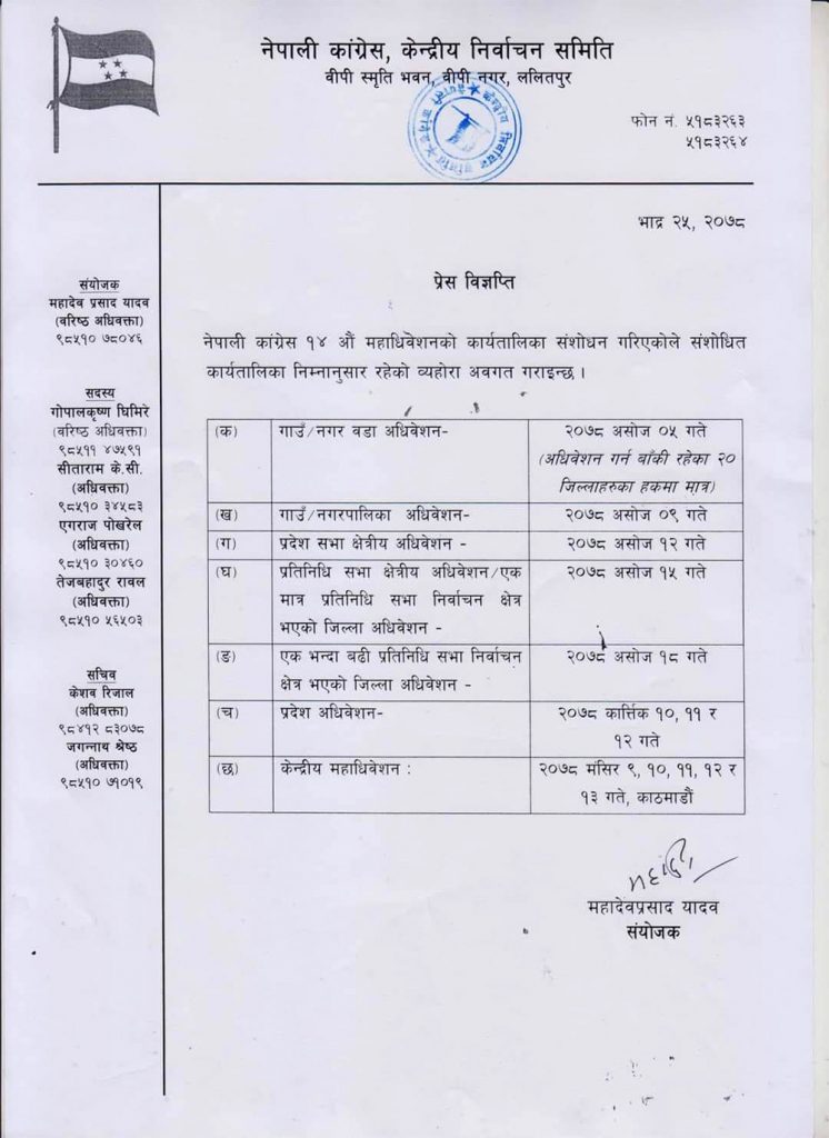 रमेश पौडेल । काठमाडौं । नेपाली कांग्रेसको महाधिवेशन कार्यतालिकामा संशोधन भएको छ । कांग्रेसको केन्द्रीय निर्वाचन समितिले शुक्रवार विज्ञप्ति जारी गर्दै १४ औं महाधिवेशनको कार्यतालिका संशोधन भएको जनाएको छ ।