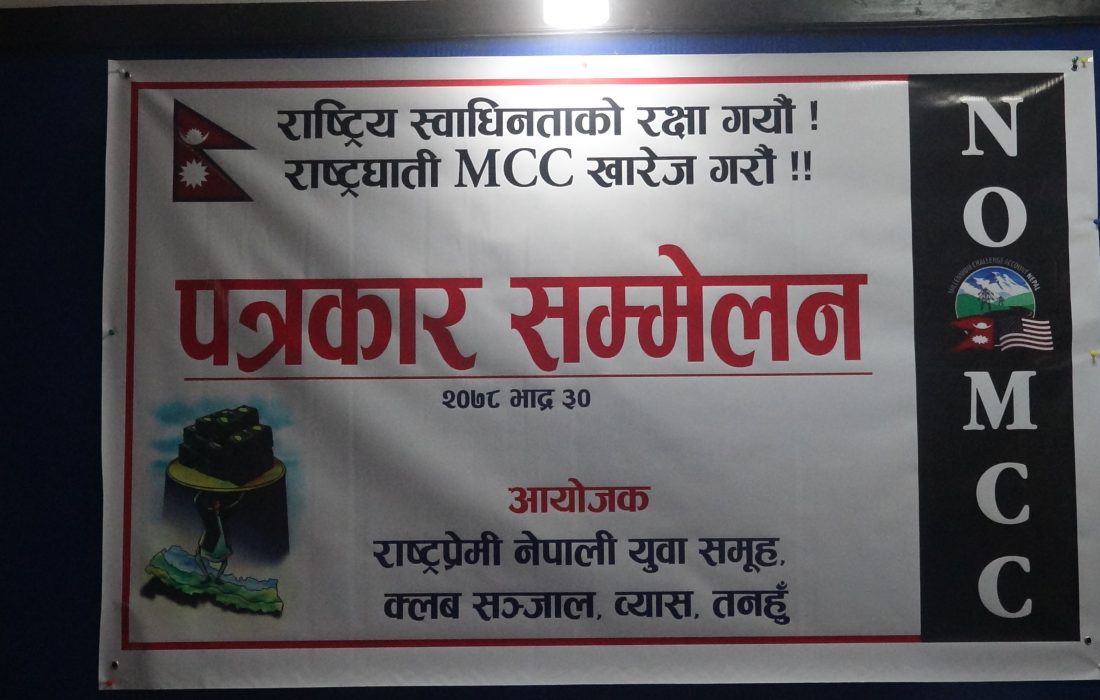तनहूँ । नेपालमा विवादस्पद भएकोे अमेरिकी सहयोग कार्यक्रम MCC को विरोधमा तनहूँको सदरमुकाम दमौलीमा कार्यक्रम हुने भएको छ । राष्ट्रप्रेमी नेपाली युवा समुह, र क्लव संजाल व्यास तनहूँको आयोजनामा असोज १ गते शुक्रवार ४ बजे उक्त कार्यक्रम हुन लागेको हो । उक्त कार्यक्रमको बारेमा आज एक पत्रकार सम्मेलनको आयोजना गरि जानकारी दिईएको छ । सामाजिक अभियन्ता मित्र दुराले ”वर्तमान नेतृत्वको नालायकिपनाले देश झन् भड्खारोमा पर्दै गएको र तिनै नेताहरुलाई खेलाएर विदेशीले MCC पारित गरेर नेपाललाई युद्धभुमि बनाउन लागेकोले दमौलीका युवाहरु जागेर MCC विरोधमा जाग्नुपरेको बताउनुभएको थियो ”साथै उहाँले ”नेतागणहरुले MCC सम्झौता संसदबाट पस गरेर देशलाई नै गुलाम बनाउन लागेकोले सबै जाग्न र MCC को विरोधको लागि कार्यक्रम सहभागि हुन पनि आव्हान” गर्नुभएको थियो ।