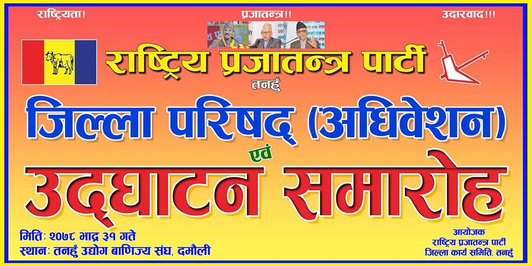 तनहूँ । राप्रपा तनहूँको भदौ ३१ हुन लागेको जिल्ला अधिवेशनमा सर्वसम्मत नेतृत्वको लागि प्रयास भए पनि सफल हुन सकेको छै न नेतृत्वको लागि वर्तमान अध्यक्ष बिनोदकुमार घर्ति, पूर्व अध्यक्ष कृष्ण पौडेल, उपाध्यक्षहरु सिता थापा र गिरिबहादुर परियार लगायतका व्यक्तिहरु आकांंक्षी देखिएपनि अन्तमा आएर २ जना उमेदवार हुन लाग्नुभएको छ ।
