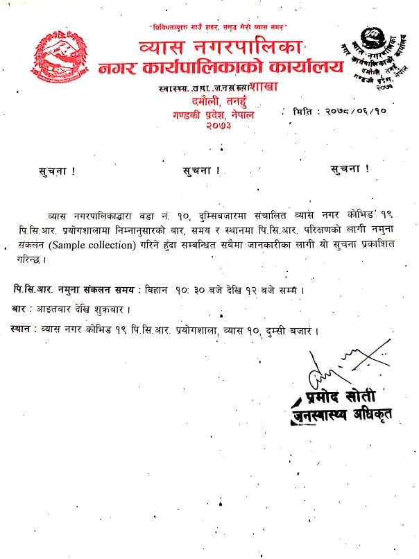 तनहूँ । व्यास नगरपालिकाको हालसालै संचालनमा आएको व्यास नगर कोभिड १९ पि. सि. आर. प्रयोगशालामा अब नियमित रुपमा पि.सिआर. परिक्षणका लागि नमुना संकलन (Sample Collection) गरिने भएको छ । आईतवारदेखि शुक्रवार सम्म बिहान १०ः ३० देखि १२ बजेसम्म पि.सि.आर. परिक्षणका लागि नमुना संकलन गरिने व्यास नगरपालिकाका जनस्वास्थ्य अधिकृत प्रमोद सोतीद्धारा जारी विज्ञप्तिमा जनाईएको छ । व्यास नगरपालिका वडा नं. १० दुम्सिमा उक्त व्यास नगर कोभिड १९ पि. सि. आर. प्रयोगशाला रहेको छ ।