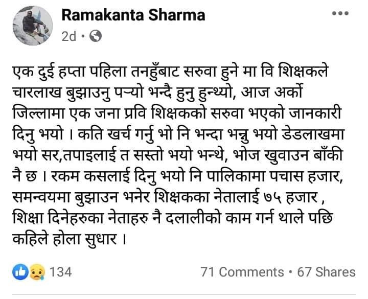 जनमानसमा पहिल्यैदेखि सुनिएको कुरालाई पुर्ण रुपमा प्रमाणित गर्दै शिक्षा समन्वय एकाईका प्रमुख रमाकान्त शर्माले लेख्नुभएको स्टाटसले शिक्षाक्षेत्रमा शिक्षकका नेताहरुले गर्ने गरेको अन्याय अत्याचारको पर्दाफास गरेको छ भने अर्कोतर्फ ”उहाँको लागि छुट्याईएको रकम शिक्षक नेताले उहाँलाई नदिएको हुनाले यो प्रकरण बाहिर आएको” जानकारहरु बताईरहेका छन् । स्मरणिय छ केहि समय अगाडि तनहूँको एक पालिकाका खनाल थरका अघोषित शिक्षान्त्री र उक्त पालिकाका प्रमुख पुत्रबिच शिक्षक सरुवा, बढुवा तथा करारमा नियुक्त गर्दा उठाईएको रकममा भागवण्डा नमिलेको कारणले पालिकाका प्रमुख पुत्रले धेरैजनासग गुनासो गर्दै ”अघोषित शिक्षामन्त्रीलाई नागेंझार बनाएर छोड्ने ” प्रतिवद्धता जनाउनुभएको थियो । यसै परिप्रेक्षमा शिक्षा समन्वय एकाईका प्रमुख रमाकान्त शर्माको तनहूँमा एउटा शिक्षक सरुवा हुदाँ ४ लाख घुस दिनुपर्ने भनाईले गर्दा त्यो दन्तबझान पनि सहि भएको प्रमाणित भएको छ अब बिस्तारै तनहूँमा हुने गरेका यस्ता कर्तुतहरुको पर्दाफास हुने सबैले अपेक्षा गरेका छन् ।