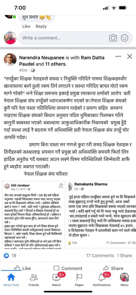 शिक्षा समन्वय एकाईका प्रमुख रमाकान्त शर्माले असोज १६ मा फेसबुकमा लेखेको स्टाटस अनुसार ”एक दुई हप्ता पहिला तनहूँबाट सरुवा हुने मा. वि. शिक्षकले ४ लाख बुझाउनु पर्यो भन्दै हुनु हुन्थ्यो, आज अर्थात असोज १६ गते अर्को जिल्लामा एक जना प्रा. वि. शिक्षकको सरुवा भएको जानकारी दिनु भयो । कति खर्च गर्नु भो नि भन्दा भन्नु भयो १ लाख ५० हजार मा भयो सर, तपाइलाई त सस्तो भयो भन्थे, भोज खुवाउन बाँकी नै छ । रकम कसलाई दिनु भयो नि भनेर सोध्दा पालिकामा ५० हजार, समन्वयमा बुझाउन भनेर शिक्षकका नेतालाई ७५ हजार , शिक्षा दिनेहरुका नेताहरु नै दलालीको काम गर्न थाले पछि कहिले होला सुधार ?” शिक्षक सरुवामा घुस दिनुपर्ने र शिक्षक नेताहरु नै दलालीमा लागेको कुरा शिक्षा समन्वय एकाईका प्रमुख रमाकान्त शर्माले लेखेपछि नेपाल शिक्षक संघको तर्फबाट नरेन्द्र न्यौपानेले फेसबुकमा नै लामो स्टाटस लेखेर शर्मालाई जवाफ फर्काउनुभएको छ । न्यौपानेले ”तनहूँका शिक्षक नेताहरुले सरुवा र नियुक्ति गरिदिने नाममा शिक्षकहरुसँग खाजाघरमा बस्ने ठुलो रकम तिर्न लगाउने र सरुवा गरिदिए बापत मोटो रकम माग्ने गरेको भन्ने शिक्षा समन्वय इकाई प्रमुख रमाकान्त शर्माको आरोप प्रती नेपाल शिक्षक संघ तनहूँको ध्यानआकर्षण भएको छ। नेपाल शिक्षक संघको कुनै पनि नेता यस्ता गतिविधिमा सम्लग्न नरहेको र प्रमाण सहित सम्लग्न पाइएमा शिक्षक संघको बिधान अनुसार पदिय भुमिकाबाट निलम्बन गरिने कानुनी ब्यबस्था भएको अबस्थामा आफुआधिकारीक निकायको प्रमुख हुँदै गर्दा संस्थालाई नै बदनाम गर्ने अभिव्यक्ति प्रती नेपाल शिक्षक संघ तनहूँ घोर आपत्ति गर्दछ” भन्नुभएको छ । न्यौपानेको स्टाटसमा विभिन्न व्यक्तिहरुले प्रतिक्रिया दिदै ” शर्माको कुरा सहि भएको ” बताउनुभएको छ भने विजय आचार्य नामक व्यक्तिले न्यौपानेलाई सम्बोधन गर्दै ‘‘दाजी तपाईकै अघिपछि देख्छु म त त्यस्ता जुकाहरु ” भन्नुभएको छ । त्यसैगरि रेडक्रसकर्मीले प्रदिप घिमिरेले ”ति शिक्षा अधिकारीकोमा भागबन्डामा आइपुग्छ भनिएजति रकम नपुगेको जस्तो” प्रतिक्रिया लेख्नुभएको छ । कल्याण सिग्देल नामक व्यक्तिले ”ए सरजी ! एउटा शिक्षक करार नियुक्ति लिदा ३० हजार तिरिराछन यसमा शिक्षक सघं कहिल्यै बोलेको सुनियन किन होला ?” भनेर न्यौपानेलाई प्रश्न गर्नुभएको छ ।