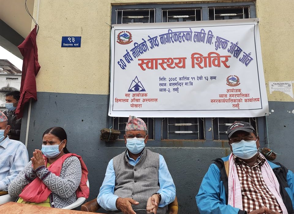 तनहूँ । तनहूँको व्यास नगरपालिकाको आयोजनामा दमौलीमा निःशुल्क स्वास्थ्य शिविर संचालन गरिएको छ । कार्तिक ११ बाट १३ गते (३ दिन) सम्म संचालन हुने शिविरको आज व्यास नगरपालिकाका प्रमुख बैकुण्ठ न्यौपानेले उद्धघाटन गर्नुभएको छ ।शिविरको उद्घाटन गर्दै प्रमुख न्यौपानेले ” नगरपालिकाले जेष्ठ नागरिकहरुलाई सेवा पुर्याउने मनसायले स्वस्थ्य शिविर अन्तर्गत आँखा शिविर संचालनमा ल्याएकोले सक्दो लाभ लिनुहुन सबैलाई आग्रह” गर्नुभएको थियो ।