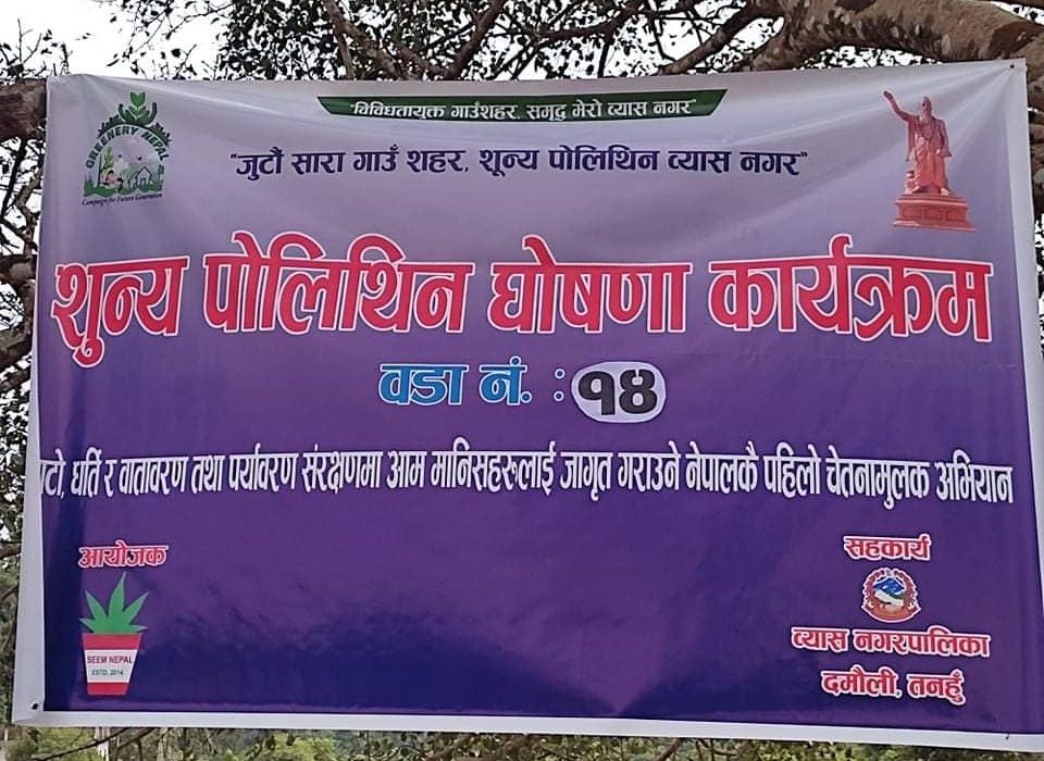 सिम नेपालका प्रतिनिधि ढाका मोहन अधिकारी ( निपेश ढाका) र व्यास नगरपालिकाका एकजना जनप्रतिनिधिका नजिकका व्यक्तिको संलग्नता रहेको उक्त संस्थाले व्यास नगरपालिकाबाट आफ्नो संस्थाले प्लाष्टिक जन्य फोहोर संकलन कार्यक्रम पारिसकेको भन्दै विभिन्न गाउँ , टोल र वडाहरुमा कार्यक्रमलाई तिब्रता दिइरहेको छ । व्यास नगरपालिकाका प्रमुख बैकुण्ठ न्यौपानेले उक्त संस्था आयोजक र व्यास नगरपालिकाको सहकार्यमा असोज ८ गते (मिति व्यास नगरपालिकाको फेसबुक पेज अनुसार) आयोजना गरेको ‘शुन्य पोलिथिन घोषणा कार्यक्रममा सहभागिता जनाईसक्नुभएको छ ।