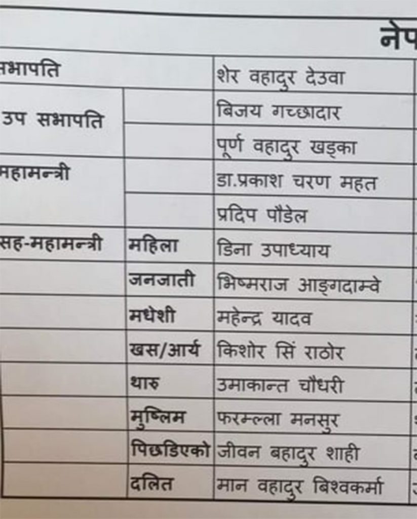 काठमाण्डौ । नेपाली कांग्रेसको महाधिवेशनअन्तर्गत नयाँ नेतृत्वका लागि शेरबहादुर देउवा र कृष्णप्रसाद सिटौलाले गठबन्धन गरी उम्मेदवारी दर्ता गराएका छन् । सभापतिमा देउवा, उपसभापतिमा विजयकुमार गच्छदार र पूर्णबहादुर खड्का उम्मेदवार बनेका छन् । सिटौला निकट प्रदीप पौडेल र देउवा निकट प्रकाशशरण महतले महामन्त्रीमा उम्मेदवारी दिएका छन् ।