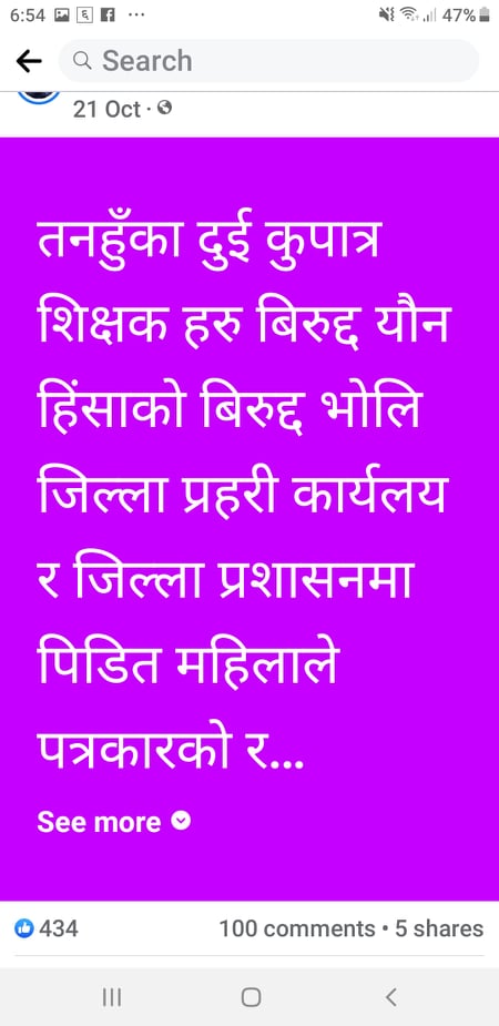 तनहूँ । कार्तिक ५ गते विहिबार तनहूँका एकजना शिक्षकका नेताले आफ्नो फेसबुक स्टाटसमा लेख्नुभो ”तनहुँका दुई कुपात्र शिक्षक हरु बिरुद्द यौन हिंसाको बिरुद्द भोलि जिल्ला प्रहरी कार्यलय र जिल्ला प्रशासनमा पिडित महिलाले पत्रकारको रोहबरमा उजुरी दिदै। वास्तविक छानबिन होला।” चिसो लाग्नै लाग्दा रातको मौषममा यो स्टाटसले धेरैको मनमा ढ्यांग्रो ठोक्यो । पत्रकारहरुलाई हात हातमा म्यासेजको स्क्रिनसट भएको कारणले ति २ जना व्यक्तिहरु को को हुन् भनेर कौतुहलता भएन तर त्यो दिन धेरै शिक्षक नेताहरुको फोनको घण्टी बज्यो भने धेरै मानिसहरु १० बजेको पखाईमा बसेको पाईयो । आखिर स्टाटसमा भनेजस्तै जिल्ला प्रहरी कार्यालय तनहूँ मार्फत साईवर व्युरोमा एक जना शिक्षक विरुद्ध मात्र उजुरी दिईयो । २ जनालाई उजुरी किन दिईएन भनेर प्रश्न गर्दा पहिला एक जनालाई दिने त्यसपछि अर्कोलाई उजुरी दिने ।
