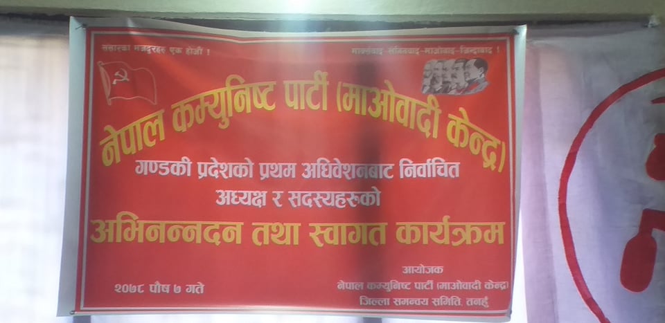तनहूँ । नेकपा माओवादी केन्द्र जिल्ला समन्वय समिति तनहूँले गण्डकी प्रदेशको प्रथम अधिवेशनबाट निर्वाचित अध्यक्ष र सदस्यहरुलाई अभिनन्दन तथा स्वागत कार्यक्रम सम्पन्न गरेको छ । उक्त अवसरमा गण्डकी प्रदेशकी अध्यक्ष गायत्री गुरुङ र जिल्लाका २१ जना निर्वाचित सदस्यहरुलाई टीका तथा खादा लगाएर भव्य रुपमा अभिनन्दन गरियो ।