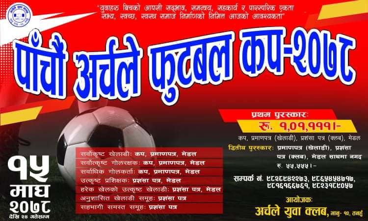 “युवाहरु बीच आपसी सद्भाव, समन्वय, सहकार्य र पारस्परिक एकता– सभ्य स्वच्छ, स्वस्थ समाज निर्माणको निमित्त आजको आवश्यकता” भन्ने मुल नाराका साथ पाँचौं अर्चले फुटबल कप–२०७८ यही आगामी माघ १५ गते शनिबारका दिन उद्घाटन गरी माघ २४ गते समापन गरिने कार्यतालिका सार्वजनिक गरिएको प्रतियोगिता आयोजना मुल समारोह समितिका संयोजक सुदिप के.सी. ले जानकारी दिनुभयो । समाजका विभिन्न क्षेत्रमा छरिएर रहेका खेल प्रतिभाले भरिपूर्ण खेलाडीहरुलाई एकिकृत गर्दै स्वच्छ, स्वस्थ एवं मैत्रीपूर्ण खेल प्रदर्शन गराउने उद्देश्यका साथ अर्चले युवा क्लबले स्थापना कालदेखि नै विभिन्न प्रकारका खेलकुद कार्यक्रमहरु संचालन गर्दै आएको पनि उहाँले बताउनुभयो ।