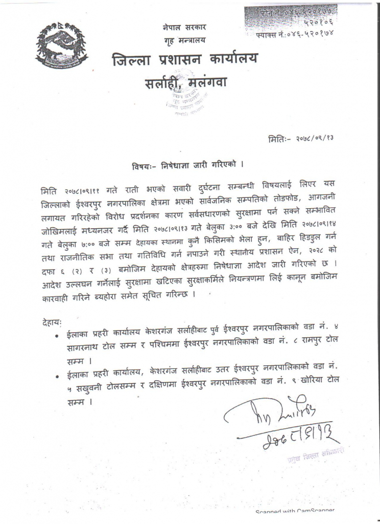 काठमाडौं । जिल्ला प्रशासन कार्यालय, सर्लाहीले ईश्वरपुर नगरपालिकाको केही क्षेत्रमा निषेधाज्ञा जारी गरेको छ ।