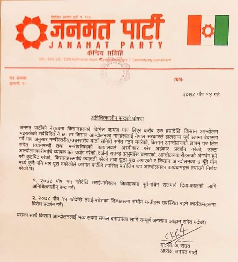 किसानको मुद्दा बोकेर आन्दोलनरत जनमत पार्टीले आजदेखि पूर्वपश्चिम राजमार्ग अनिश्चितकाल बन्दको घोषणा गरेको छ ।