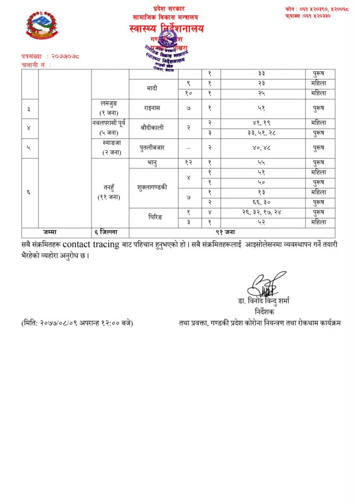 स्वस्थ्य निर्देशनालय गण्डकी प्रदेशको पोखराको दिनको १२ बजे प्रकाशित सूचना अनुसार तनहूँमा नगरप्रमुख गुरुगं सहित ११ जना कोरोना संक्रमित थपनिुभएको छ । ति मध्ये शुक्लागण्डकी नगरपालिकाका ५ जना, घिरिगं गाँउपालिकाका ५ जना र भानु नगरापलिकाका १ जना हुनुहन्छ ।