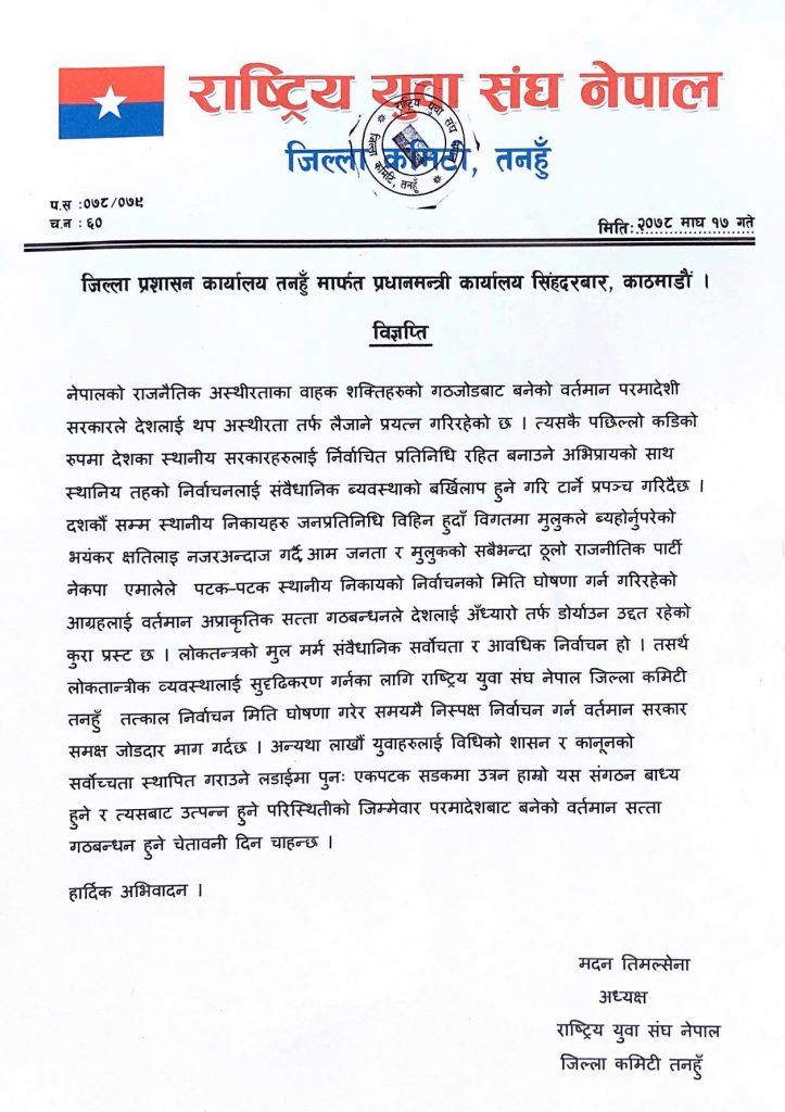 लोकतन्त्रको मुल मर्म संवैधानिक सर्वोच्चता र आवधिक निर्वाचन हो । तसर्थ लोकतान्त्रीक व्यवस्थालाई सुदृढिकरण गर्नका लागि राष्ट्रिय युवा संघ तनहूँ जिल्ला तत्काल निर्वाचन मिति घोषणा गरेर समयमै निस्पक्ष निर्वाचन गर्न वर्तमान सरकार समक्ष जोडदार माग गर्दछ । अन्यथा लाखौ युवाहरु लाइ विधिको शासन र कानूनको सर्वोच्चता स्थापित गराउने लडाईमा पुनः एकपटक सडकमा उतार्न हाम्रो संगठन बाध्य हुने र त्यसबाट उत्पन्न हुने परिस्थितीको जिम्मेवार परमादेशबाट बनेको वर्तमान सत्ता गठबन्धन हुने चेतावनी दिन चाहन्छ ।