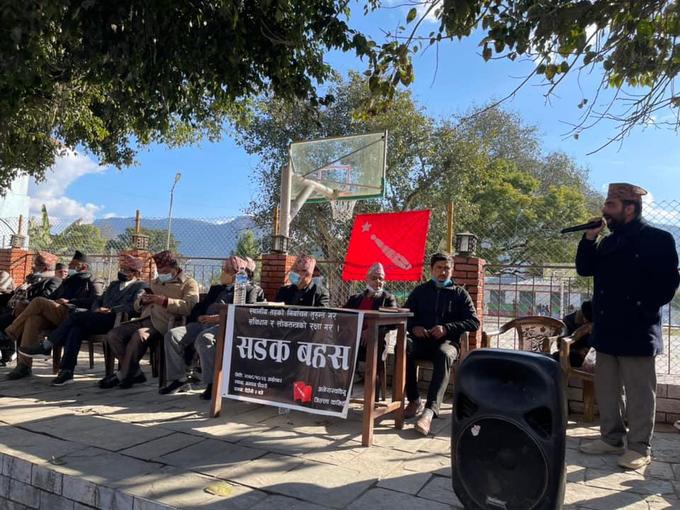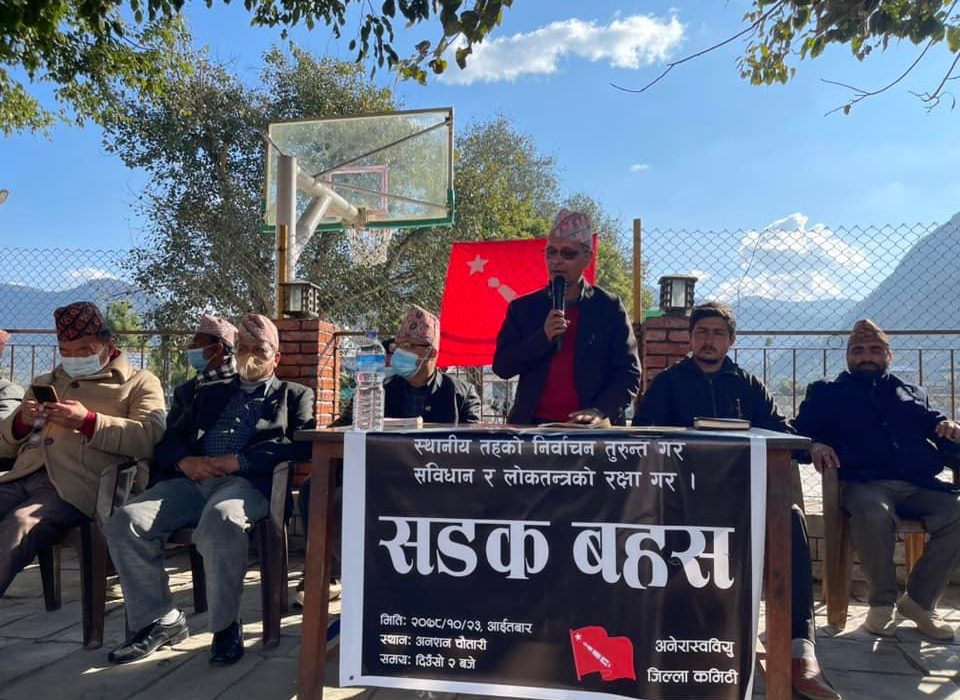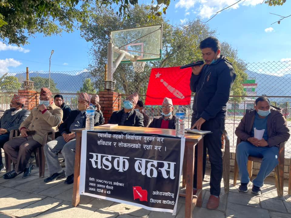 तनहूँ । अनेरास्ववियु तनहूँले वर्तमन् सरकारलाई स्थानिय निर्वाचनको मिति घोषण गर्न दवाव दिने उद्धेश्यले तनहूँको दमौलीमा सडक बहश चलाएको छ । निर्वाचनको मिति घोषणा नगरेर वर्तमान सत्ताले संविधानको धज्जी उडाएको बताउदै उक्त सडक बहशमा सहभागी वक्ताहरुले छिटोभन्दा छिटो स्थानिय तहको निर्वाचनको मिति तोक्न सरकारलाई आग्रह गर्नुभएको थियो ।