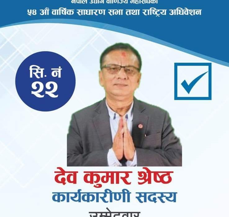साथीहरुको साथ सहयोग र आफुले नेपालभरका व्यवसायीको लागि लागेको हुनाले यसपटक पनि साथ पाउने बताउनुहुन्छ नगर तथा जिल्ला उद्योग वाणिज्य संघबाट दाश्रो पटक उमेदवारी केन्द्रिय सदस्य पदमा उमेदवारी दिनुभएका उम्मेदवार देवकुमार श्रेष्ठ । नम्र र सरल स्वभावका श्रेष्ठ केन्द्रिय सदस्य पदमा यसपटक पनि विजयी भएर आउने तनहूँवासीले आशा राखेर बसेका छन् र चुनाव अगाडि भेटघाट गर्दा पनि त्यस्तै अवस्था रहेको रहेको बताउनुहुन्छ तनहूँ ृउद्योग बाणिज्य संघका प्रथम उपाध्यक्ष बैकुण्ठनाथ मिश्र ।