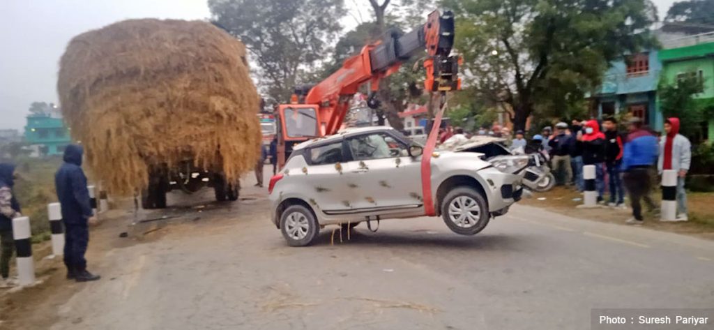 बुटवल उपमहानगरपालिका वडा नं. १२ तामनगर नजिक पूर्व(पश्चिम राजमार्गमा रोकिराखेको लु २ ख ९७७२ नम्बरको ट्रकमा लु ३ च ४४४२ नम्बरको कार सोमबार बिहानै ठोक्किएको प्रहरीको भनाइ छ ।