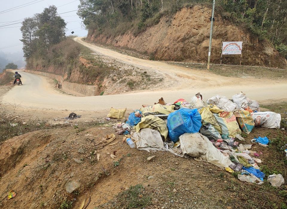 व्यास नगरपालिका वडा नं. १० निवुवाटारीको माथिल्लोभाग (तालघरे दुम्सिचौर पोखेरल फाँटमोटरमार्गमा कालिडाँडा जाने स्थान) को सडक छेउमा पोलिथिन भएका बोराहरु असरल्ल देखिएका छन् ।