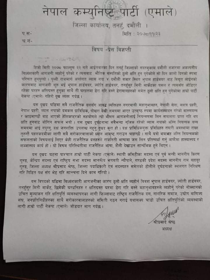 हिजो मिती २०७८ फाल्गुण २२ गते आइतवारका दिन तनहुँ जिल्लाको सदरमुकाम दमौली वजारमा अकल्पनीय विध्वंशकारी आगजनी व्यहोर्नु परेको र त्यसवाट भौतिक सम्पतिको ठूलो क्षति हुन पुगेकोले सो दिन कालो दिनको रुपमा परिणत हुनपुग्यो । पृथ्वी राजमार्ग अन्तर्गत व्यास नपा ४ दमौली वजार स्थित भुपाल हार्डवयरवाट विद्युत लाइनको कारणवाट आगजनी शुरु भई भुपाल हार्डवयर, ज्योति हार्डवयर, तनहुँसुर मिनी मार्केटका पसल र त्यससँग जोडिएर रहेका घरहरु क्षतिग्रस्त हुनुका साथै ती घरहरुमा डेरा गरी वस्ने डेरावालहरुको समेत ठूलो क्षति हुन पुगेकोमा हाम्रो पार्टी नेकपा (एमाले) गहिरो दुःख व्यक्त गर्दछ ।